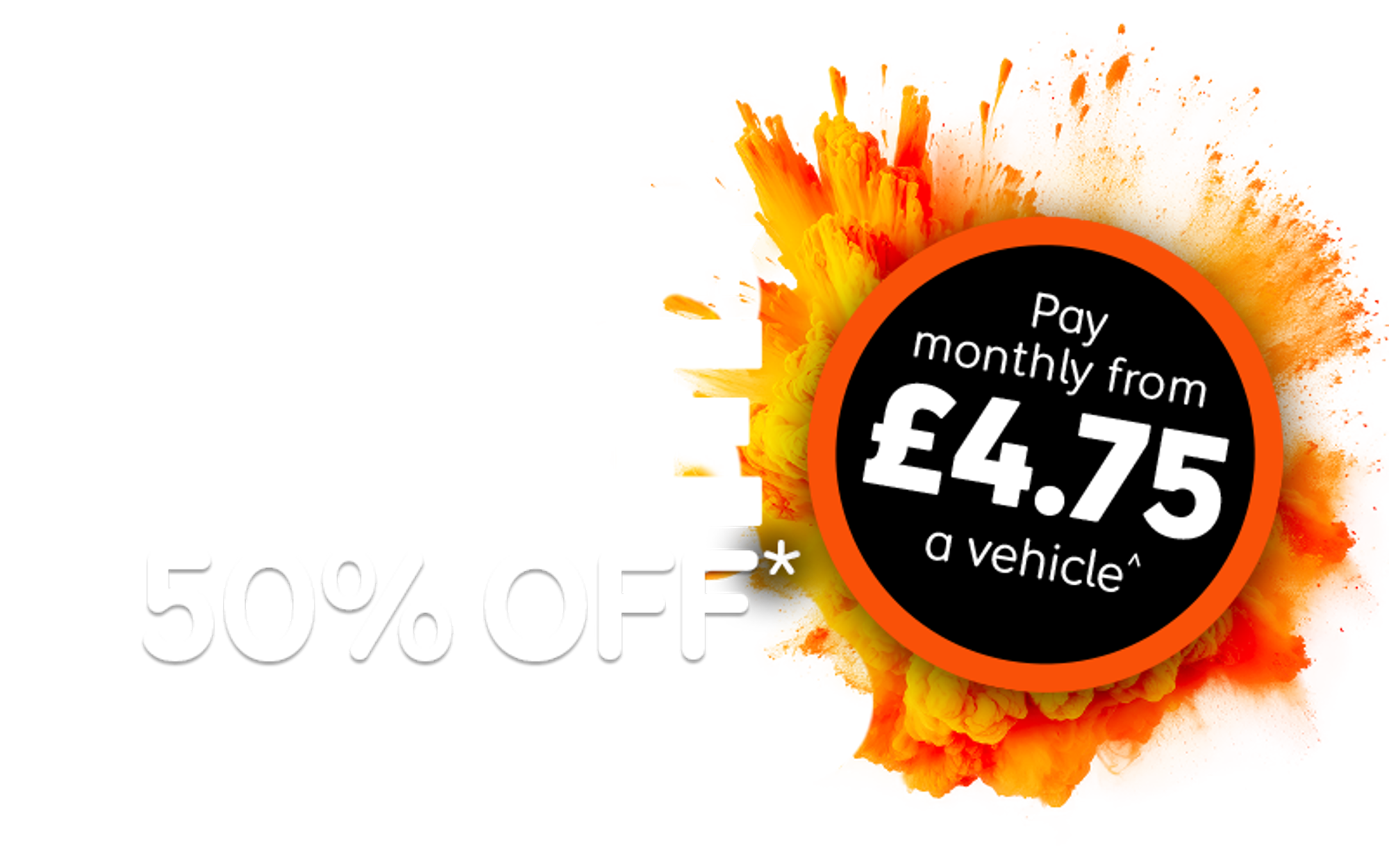 *Applies to new Roadside, Recovery and At Home for 1-24 vehicle fleets. Max 50% on Fleets 1-5. Ends 01/12/25. ^Price a month per vehicle, fleets of 5. †The driver and up to 8 other people travelling in the vehicle (16 if the vehicle is a minibus).